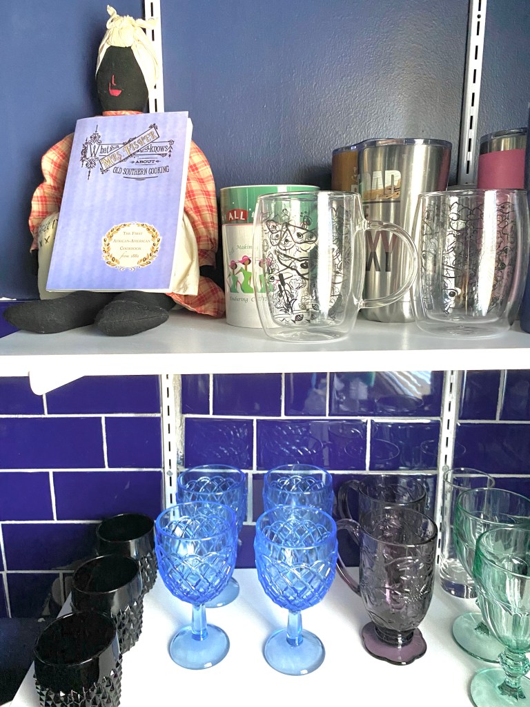 Once I got home, I decided to place Mammy on display in my kitchen for a number of reasons, but primarily because historically Black women have been responsible for preparing meals for their family, community, etc. When I look at her, i think of the ancestors who were forced to prepare meals for their enslavers as well as the ancestors who lovingly prepared meals for their family and friends. I think of my grandmothers and their relationship to food and cooking and I think of how I will engage my own daughter around cooking, food, and caretaking. It’s loaded! But critical that I had this piece to start a conversation in the kitchen with whomever visits and sees Mammy doll (I should probably come up with a different name).